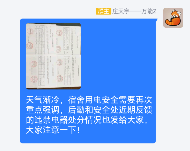 11月份以来,随着天气逐渐转冷,在近期多次后勤巡查宿舍反馈情况,发现违规使用大功率及电热器具的学生数量有明显的抬头趋势,结合国内各地高校近期出现的违规用电导致的宿舍及实验室安全事件,计工学院迅速成立了由院党委副书记王雪佳牵头、学生工作相关老师为核心的加强校规教育工作小组,以规范用电和校内行为规范为重点内容,通过主题班会、线上宣传、典型事件教育等形式,组织本科生开展校规校纪学习系列活动。