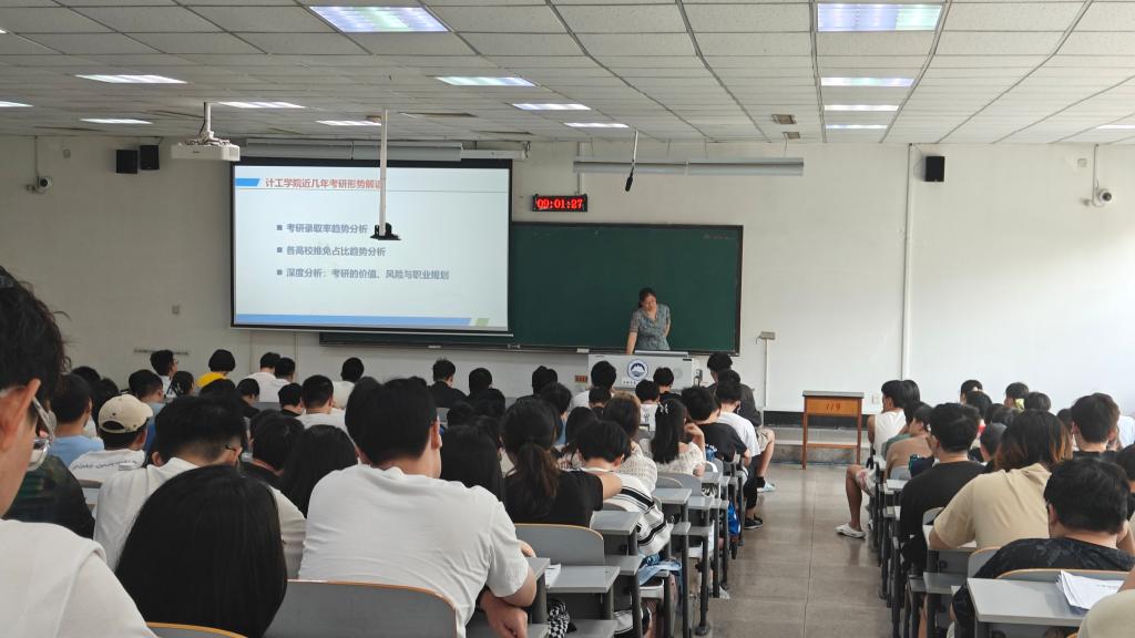 会上,宋昕和王聪分别为计算机类和电子信息类的同学全面分析了考研录取率趋势和各高校推免占比趋势。总体上看,近几年考研录取率整体下降趋势明显,竞争愈加激烈,各高校推免生占比上升趋势明显,推免比例越高,统考难度增大。会议深入分析了考研的价值、风险和职业规划,希望同学们能够合理择校、认真备考,并建议做好备选方案,积极参加秋招。