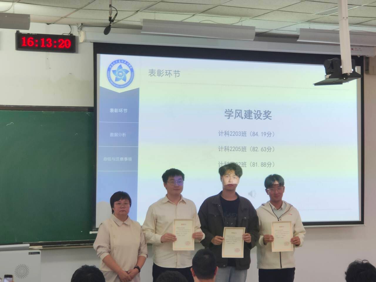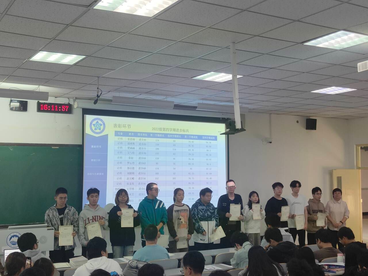 大会上,陈晶晶首先对2023-2024学年第二学期期末考试的成绩进行了总结、分析及表彰。陈晶晶首先从个人学习成绩,进步幅度,以及班级均分等方面对优秀学生和集体进行了表彰,希望优秀的同学要戒骄戒躁、不断超越自我,希望目前成绩不理想的同学要迎难而上、奋起直追、争取好成绩,希望各班开拓创新、互帮互助、共创良好学风班风。