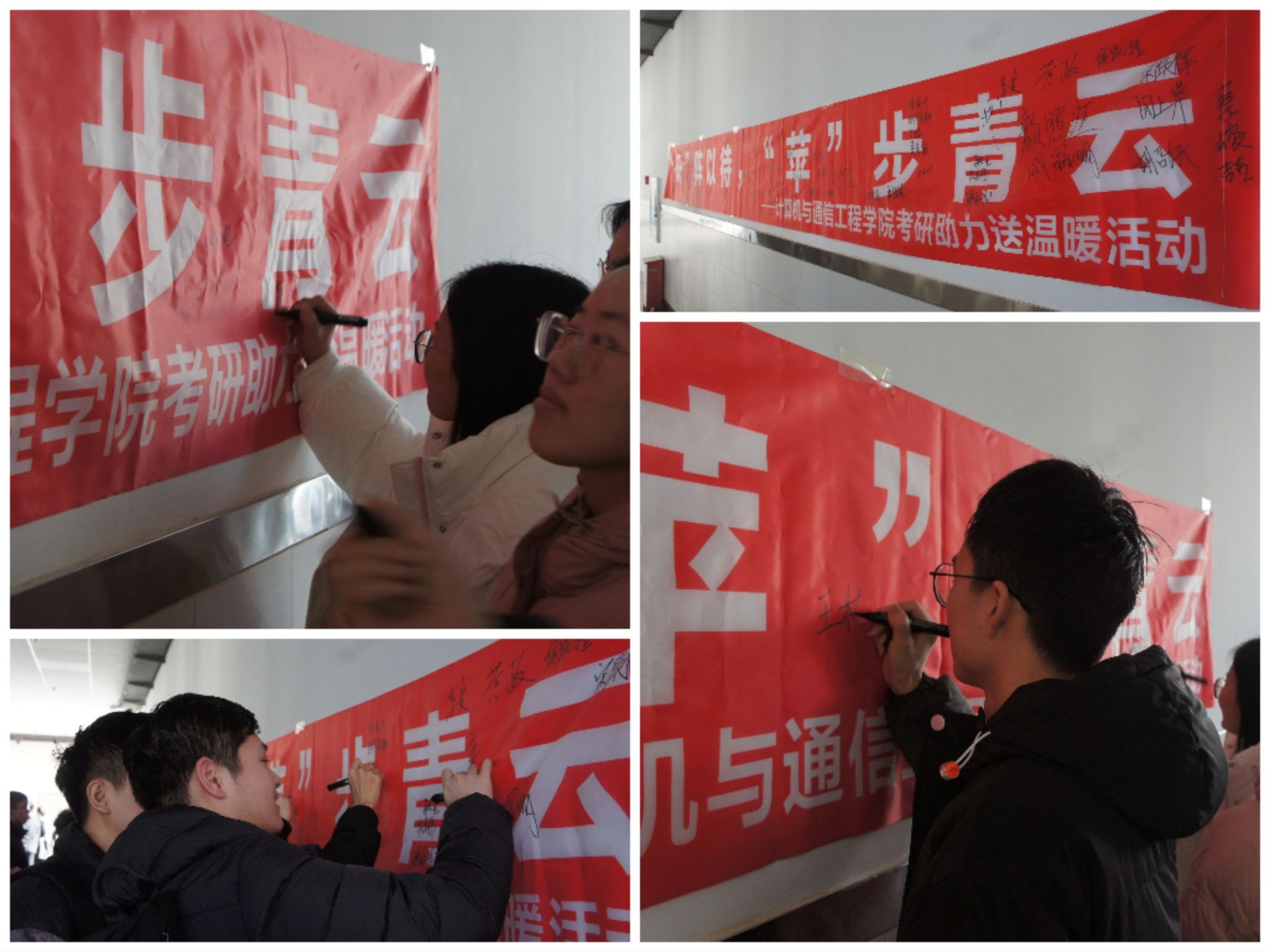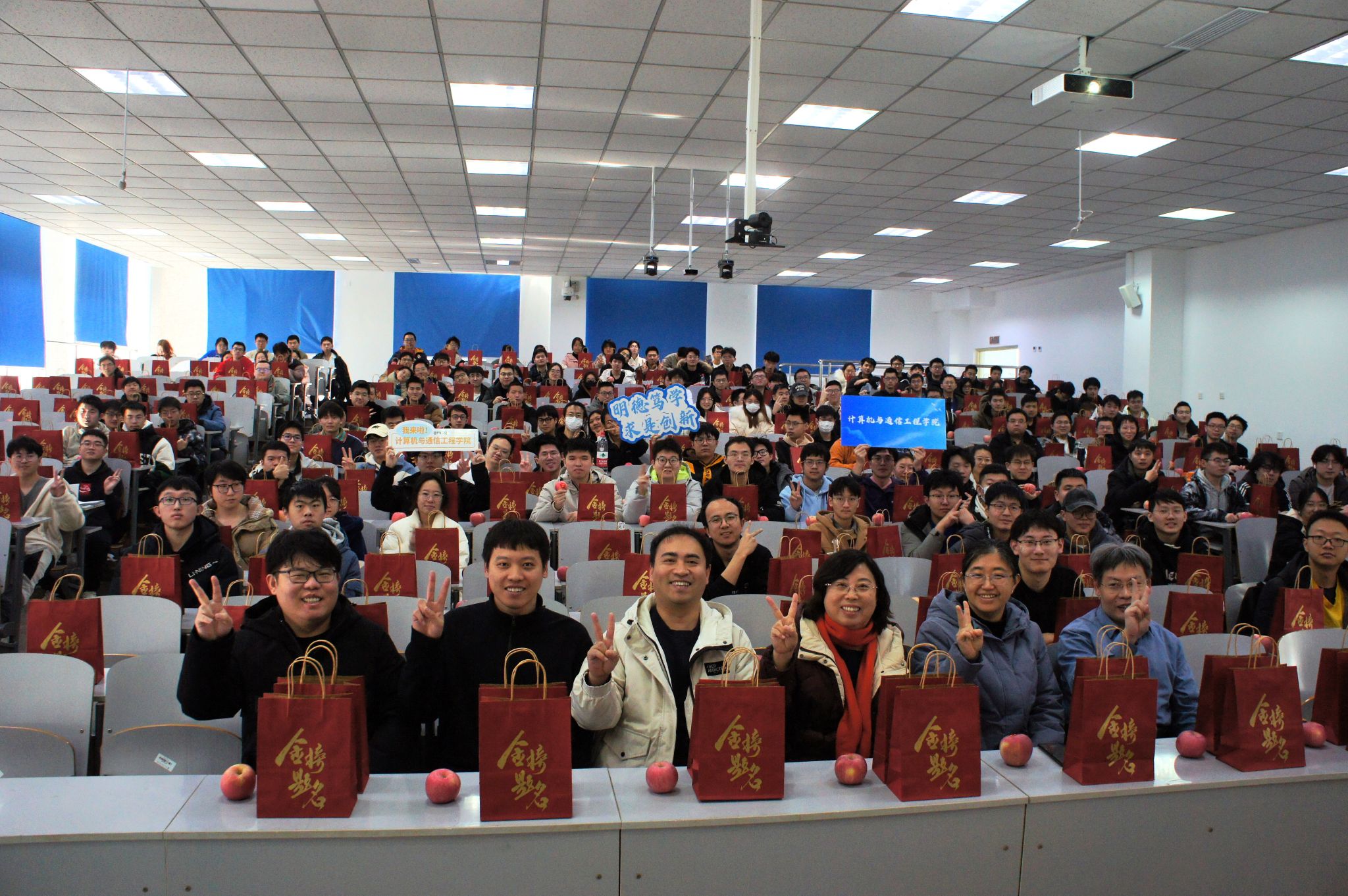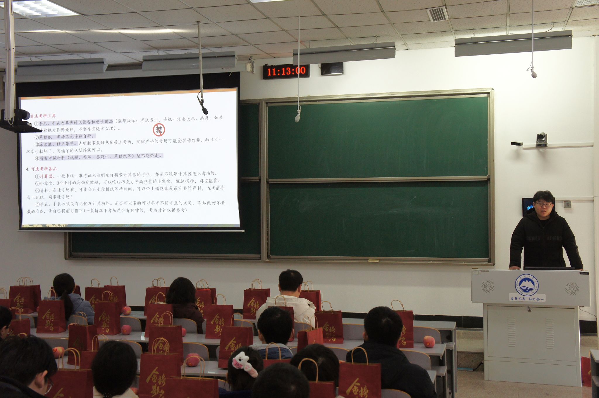 活动前期,学院精心准备了装有考试文具和贴心寄语的“福袋”以及象征‘苹’心静气、‘苹’步青云的苹果。活动现场,宋昕向考研学子表达了鼓励,暖心的话语寄托着学院老师的殷切祝福,激励同学们不畏艰难,奋勇向前,为考研之路注入强大动力。辅导员樊灵伟就考研当天的具体时间安排、考场相关注意事项以及考前生活作息方面分别进行了细致地讲解。师生围绕考研最后阶段各方面的事宜进行了热烈讨论。最后,嘉宾老师在主题条幅上留下诚挚的祝愿,即将奔赴考场的学子们领取了 “福袋”及祝福苹果并在条幅上签名留念。