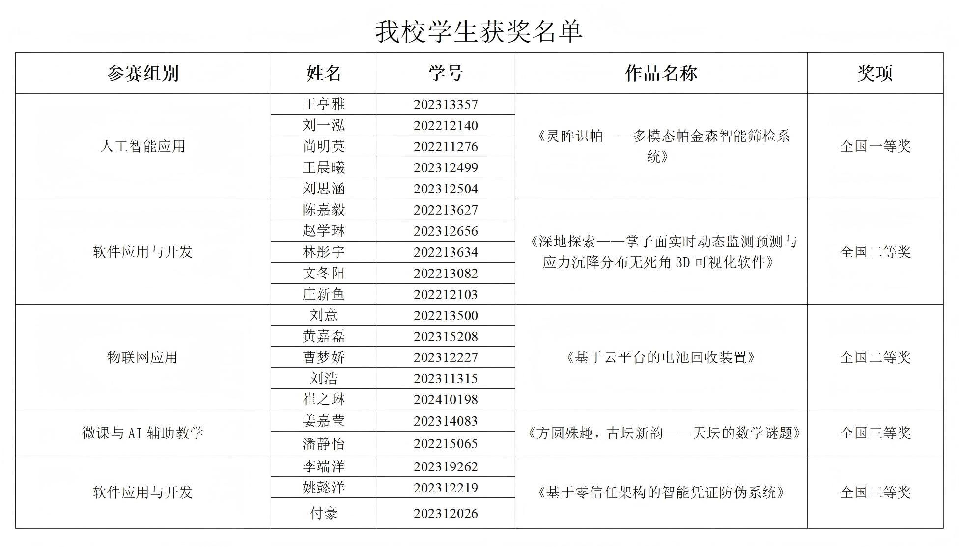 近日,2025年(第18届)中国大学生计算机设计大赛全国总决赛成绩揭晓,我校学生荣获一等奖1项、二等奖2项、三等奖2项。米乐官网8名学生分别获全国一、二、三等奖。