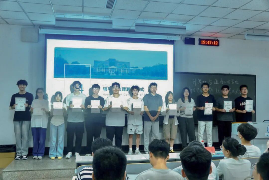 助导聘任环节中,尹亚冲、樊灵伟为2025级全体辅导员助理颁发聘书并合影。助导代表承诺将尽职尽责为新生提供学业指导与生活支持,助力快速融入大学环境。