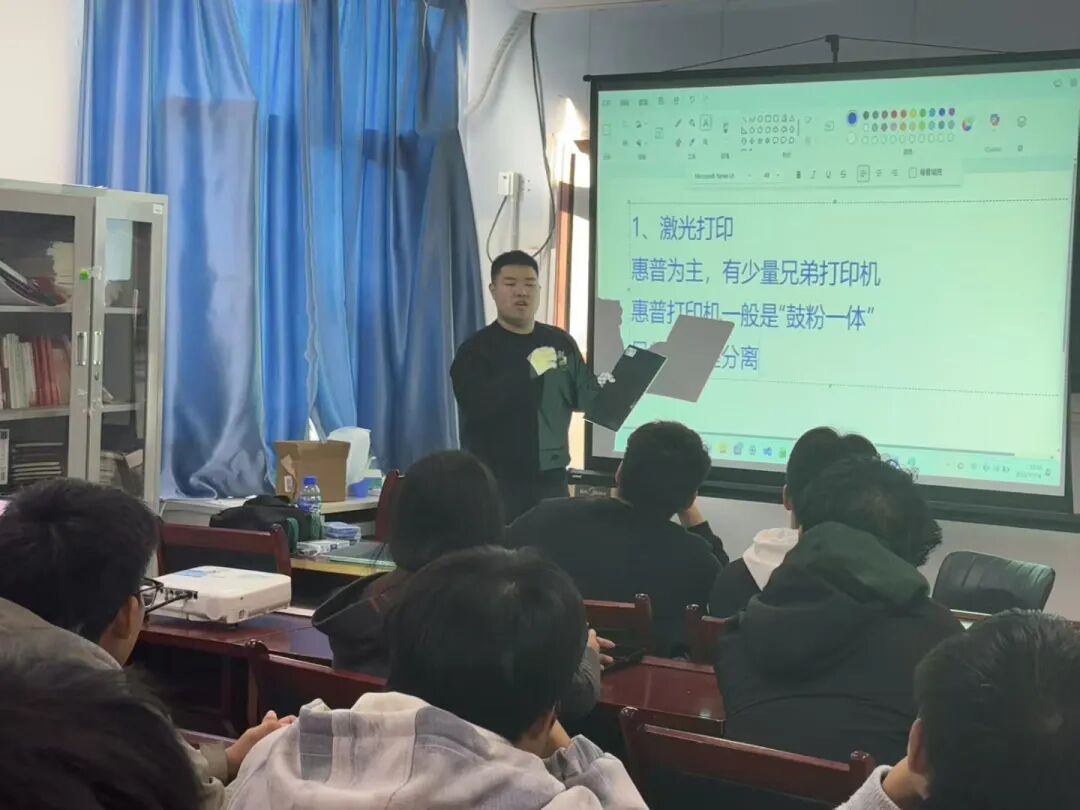 培训会上,刘宇航围绕打印机与电脑两大主题,系统梳理了常见办公设备的维护与维修知识。在打印机部分,重点讲解了校内主流激光打印机类型的识别、常见卡纸问题的处理、更换耗材的规范操作以及驱动安装的要点,并对喷墨打印机的工作原理与基础维护进行了介绍。在电脑维修部分,重点讲解了系统重装前的注意事项、C盘空间清理、硬件维护(如硅脂涂抹)的基本常识以及常见故障的排查思路。