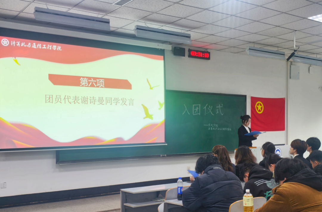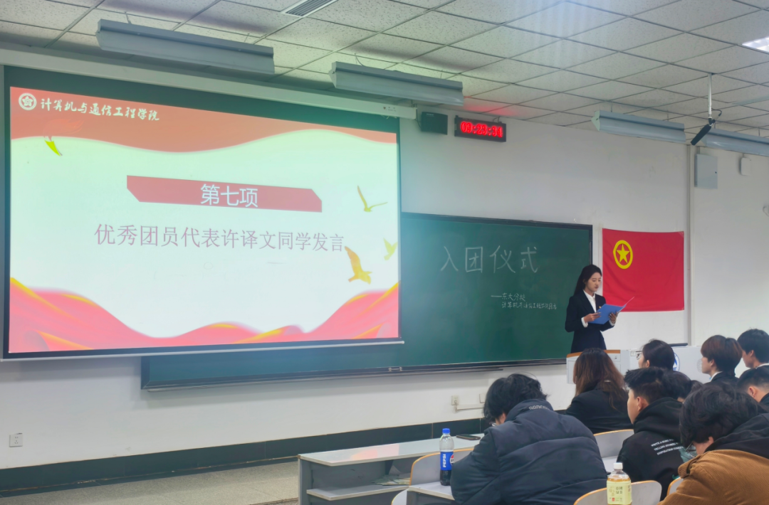 优秀团员代表许译文上台发言,展现榜样力量。随后,杜超颖向新团员提出希望与要求,希望各位团员时刻以团员标准要求自己,认真接受政治训练、加强政治锻造、追求政治进步。最后,团员们齐唱团歌,在歌声中结束了入团仪式。