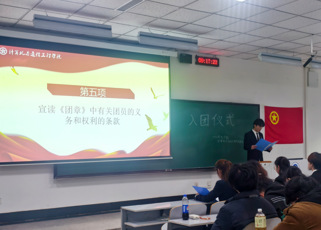 团委副书记焦子健上台宣读《中国共产主义青年团章程》中有关团员的义务和权利的条款并勉励各位团员时刻铭记入团初心。
