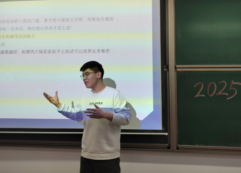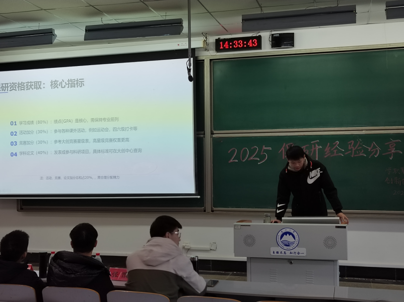 詹超着重讲解了综合成绩的评定标准,以及综合素质测评的成绩评定标准。他建议同学们持续地收集保研的有关信息,同时强调绩点的重要性,并着重分析了学好英语的必要性。